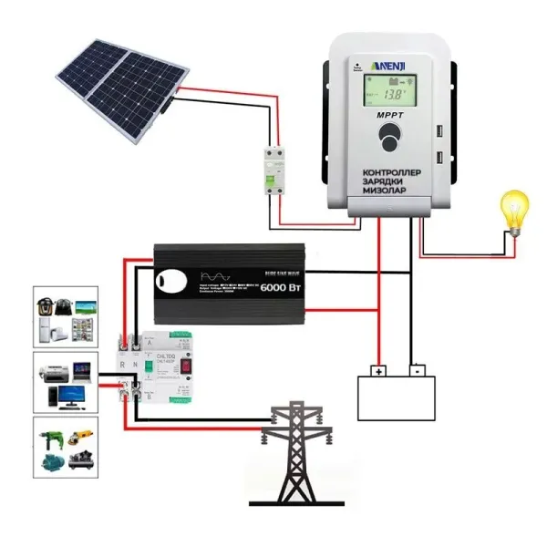 Гибридный инвертор ANENJI 2000W 12V — это многофункциональное устройство, объединяющее в себе инвертор, солнечный MPPT-контроллер, зарядное устройство и систему автоматического переключения питания. Он предназначен для создания автономных или резервных систем электроснабжения в домах, дачах, мастерских, а также для мобильных решений (кемперы, яхты и т.д.).