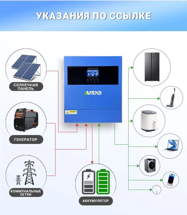 Гибридный инвертор ANENJI 2000W 12V — это многофункциональное устройство, объединяющее в себе инвертор, солнечный MPPT-контроллер, зарядное устройство и систему автоматического переключения питания. Он предназначен для создания автономных или резервных систем электроснабжения в домах, дачах, мастерских, а также для мобильных решений (кемперы, яхты и т.д.).